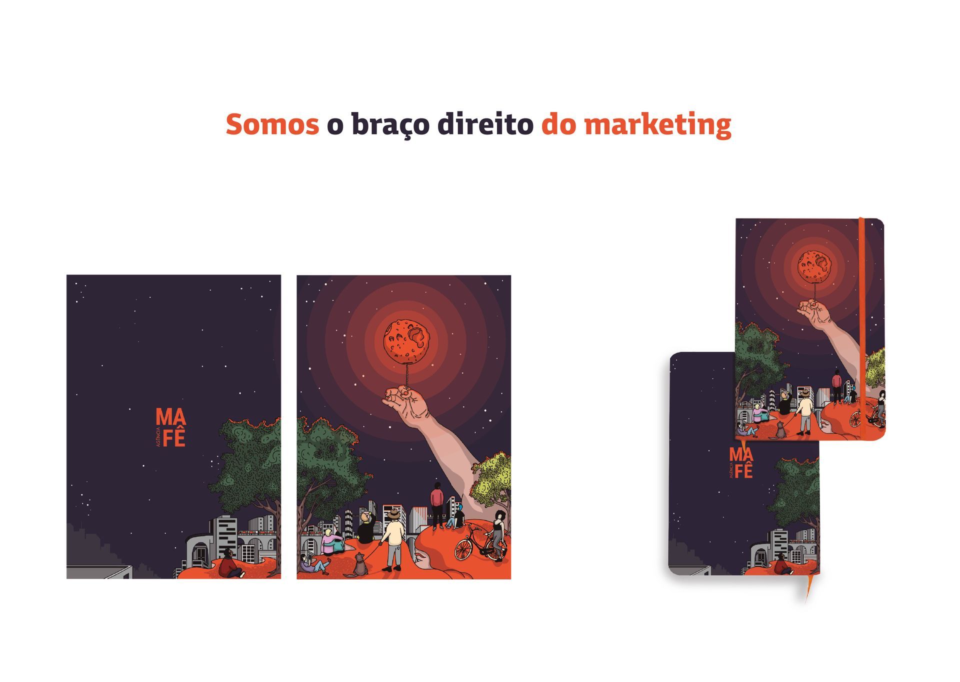 O desafio do projeto foi sintetizar a frase “Somos o braço direito do marketing” para um conjunto de ilustrações. Cada ilustração foi criada para acompanhar um texto da marca, portanto fizemos através do desenho um síntese desses textos, comunicando de maneira lúdica, inteligente e bem humorada com o publico-alvo. O projeto foi criado para o site da agência e aplicado em um moleskine. Os desenhos foram pensados para ambientes sociais sem perder a descontração, nos levando o entendimento direto de que a agência esta preparada para atender todas as demandas do mercado.